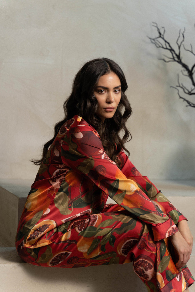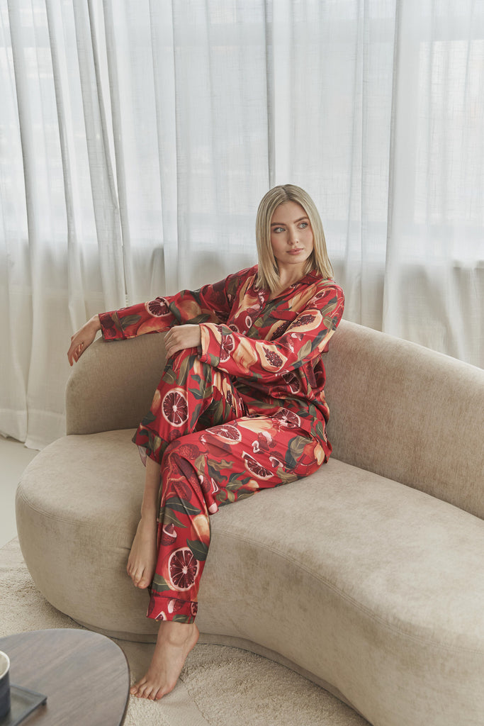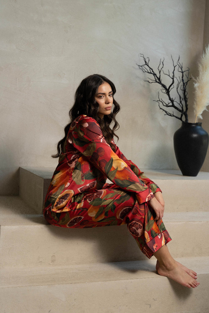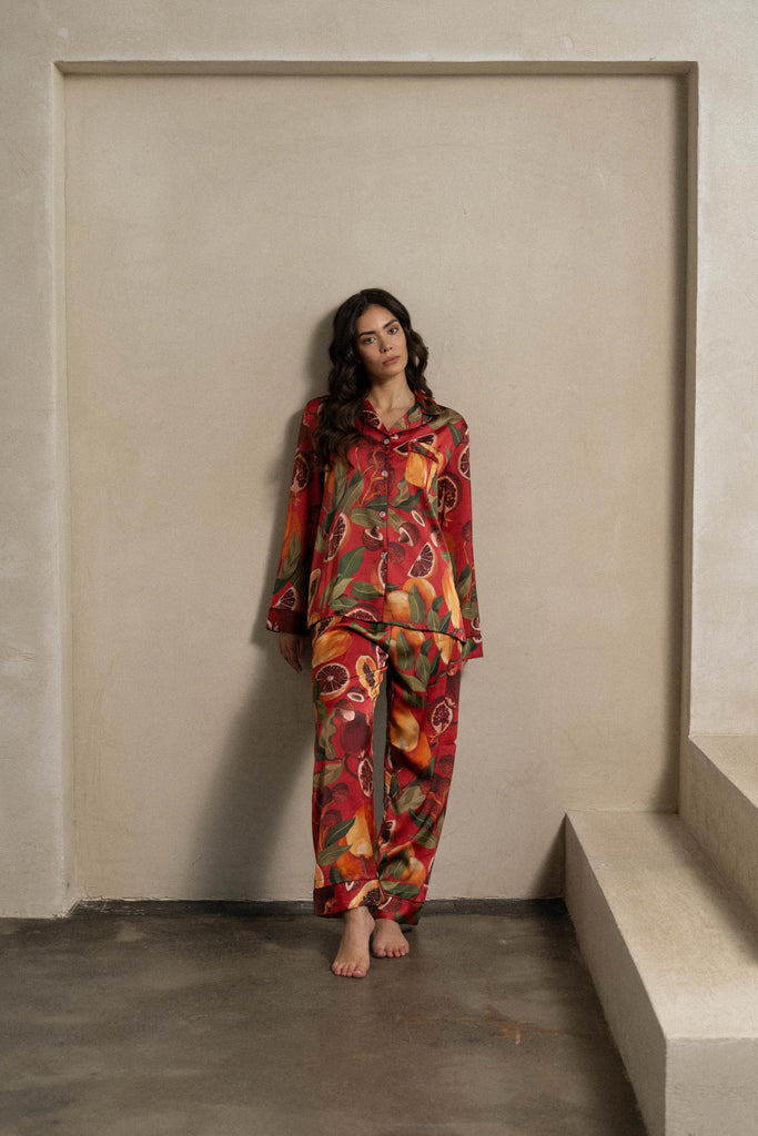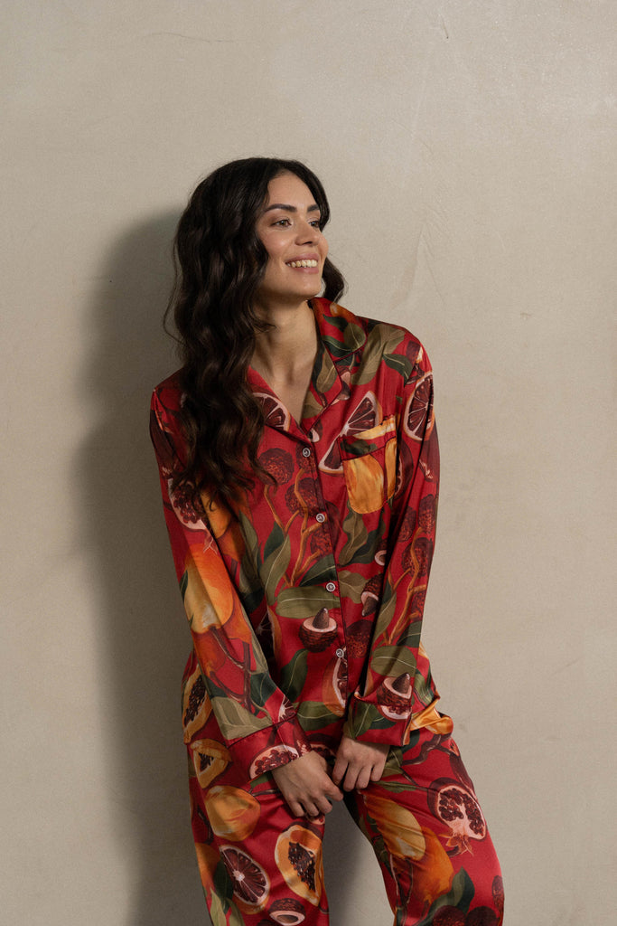 MIJAME Satin Pyjama Set mit Tropischen Früchten in Rot