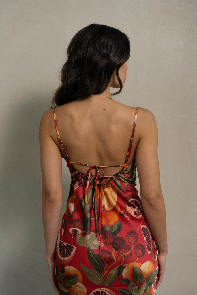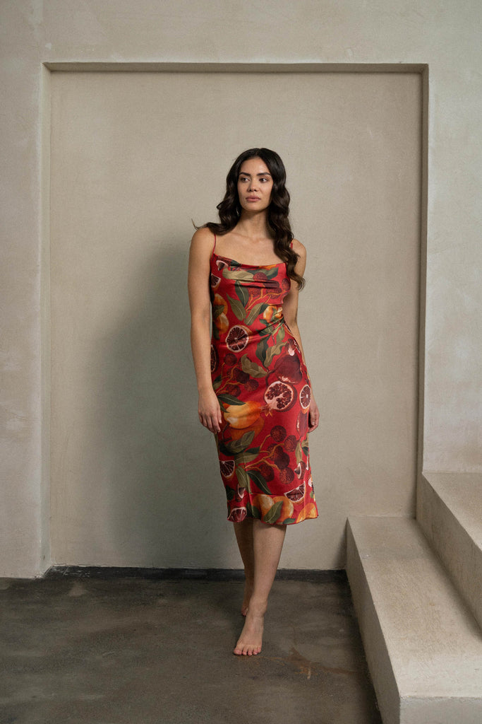 Dieses bezaubernde Satin Kleid ist das perfekte Outfit für Cocktailparties, Sommerfeste oder romantische Abendessen. Das Kleid hat ein kunstvolles Muster, das Mangos, Papayas, Litschies und Blutorangen in lebendigen Farben darstellt.